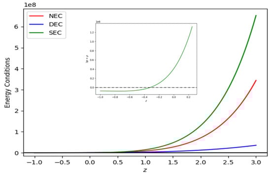 - Weak energy condition (WEC): The matter–energy density measured by any time-like observer should be positive, . WEC implies that the energy density should not be negative