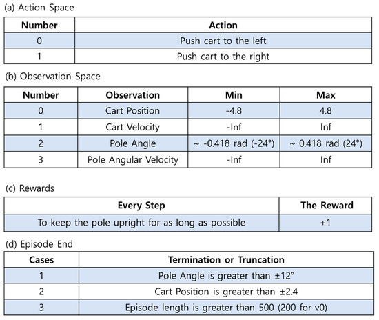 The cart pole [25] is part of a classic control environment. A cart pole was proposed in an environment that could solve the research control problem [48]. The poles were attached with nonactuated joints to carts that moved along frictionless tracks. The pendulum was placed perpendicular to the cart, and the goal was to balance the pole by applying forces to the left and right sides of the cart. As shown in Figure 2, action can have {0, 1} values representing the direction of the fixed force pushing the cart. The observed values correspond to position and speed. During an episode, the cart x-position (index 0) can have values between (−4.8 and 4.8), and the polar angle can be observed between (−0.418 and 0.418) radians (or ±24°). The reward was to keep the pole upright for as long as possible, and a reward of +1 was acquired. The reward threshold was 500 for cart-pole v1. Initially, all observations were assigned a uniform random value of (−0.05, 0.05). An episode was terminated when one of the following conditions was satisfied: (1) the polar angle was greater than ±12°; (2) the cart position was greater than ±2.4 (the cart center reached the edge of the display); and (3) the episode length was greater than 500. In particular, for the cart pole, the state action space is symmetric with respect to the plane perpendicular to the cart’s direction of movement. So, utilizing rewards is appropriate for environments such as cart poles.