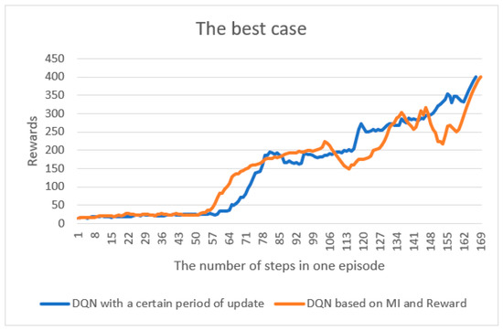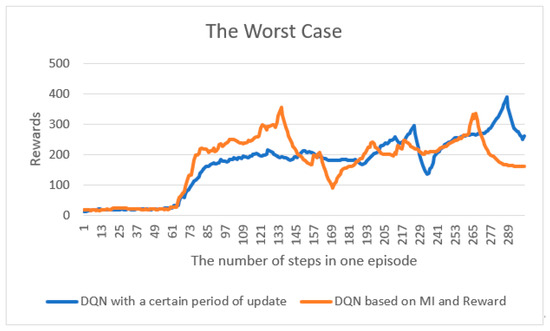 The worst-case comparison between the previous model (DQN with a certain period of update) and the proposed model (DQN based on MI and Reward), which finished in the maximum number of steps in one episode without reaching the average reward.