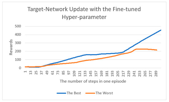 For a better solution, we considered certain requirements, such as recent implementation studies [25,26,27], such as reducing the number of steps in an episode. In one case, if the episode does not reach its maximum and the pole ends in the middle, a reward of −1 is received; in the other case, if the average reward is 400 or more, the episode is terminated. Figure 3 shows the best case in which the reward is reached. We can observe that the results of the method proposed in this study are almost similar to the previously well-known DQN that updates the target-network after setting “a certain period of time”, such as the hyper-parameter for the update. It can be observed that if the hyperparameter setting is performed well in the beginning, good results can be obtained, even if the target-network is updated in a fixed manner. Figure 4 compares the worst cases in a manner similar to that of the best cases. In addition, the participants did not complete the maximum number of steps. This implies that the goal of reinforcement learning is to maximize future rewards and not ensure future rewards. Figure 5 shows the average of the best and worst cases by adjusting the fine-tuned hyperparameter settings, even if the target-network is updated in a fixed manner. It can be observed that even if the target-network is updated in a fixed manner, the result can be quite different depending on the settings of the hyperparameters.