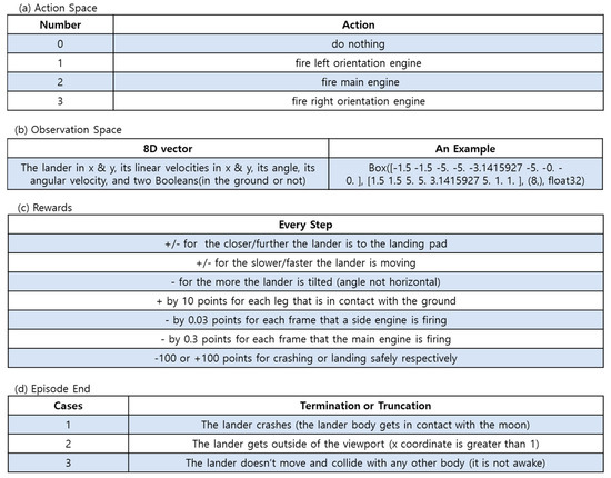 - LunarLander V2. Available online: https://gymnasium.farama.org/environments/box2d/lunar_lander/ (accessed on 1 June 2023).