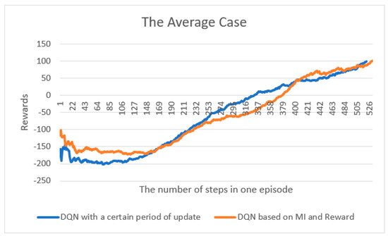 Average case comparison between the previous model (DQN with a certain period of update) and the proposed model (DQN based on MI and Reward), which finished in +100.