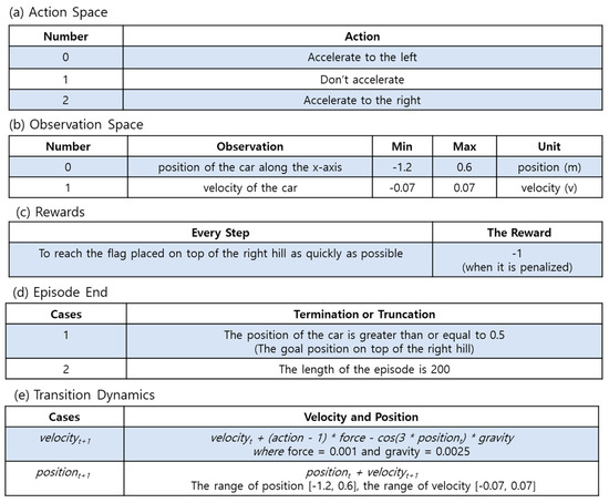 Generally, it is difficult to experiment with DRL in an environment in which sparse rewards are provided. Therefore, MountainCar [28], which is a representative example of an extremely sparse reward environment, was considered. MountainCar, such as cart-pole [25], is part of the representative environment for classic control in OpenAI Gym [24]. As shown in Figure 8, MountainCar had a discrete action space. Continuous action spaces also exist. In this study, only discrete action spaces were considered. MountainCar was a deterministic Markov decision process (MDP) [41] consisting of cars stochastically placed at the bottom of a sinusoidal valley. The only possible operation was acceleration, which could be applied to the car in the other direction. The goal of MountainCar was to strategically accelerate the car to reach the target condition on top of a hill on the right. However, the engine of a car was not strong enough to climb a mountain at once. The only method to achieve this goal was to drive back and forth to build momentum. The car started each episode from a standstill on the valley floor between the hills (at approximately −0.5 of the position). The episode ended when the car reached the flag (at a position greater than 0.5) or moved 200 steps. For each move, the car performed three actions (push left, push right, or do nothing). A penalty of 1 unit was applied for each move (doing nothing or reaching a half-point). In contrast to Cart-Pole [25] and LunarLander [31], MountainCar [28] followed the transition dynamics when given a motion.