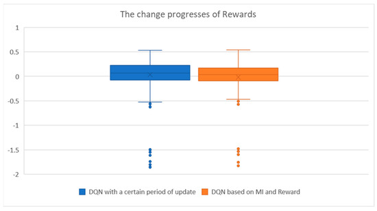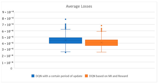 For a more qualitative comparison, the average loss was compared with a previously well-known DQN, which updates the target-network after setting a certain update period using the method proposed in this study. As shown in Figure 9, the box plot of the average loss showed a small but significant difference. Figure 10 shows a box plot of the differences in the change process for the rewards. When comparing the average losses, the loss of the method proposed in this study had a small loss range (the difference between the minimum and maximum), and the position of the box was relatively lower, which implies that the variability of the losses was smaller than that of the well-known DQN. Moreover, the number of outliers was relatively small. In the box plot of the reward changes, the variance (difference between the minimum and maximum) was significantly smaller than that of the well-known DQN. Moreover, the outliers were relatively small, similar to the shape of the box plot of the average losses. To obtain these results, the length of the episodes was increased from 200 to 1000, and only the results with a similar number of episodes reaching the top of the hill on the right were selected. These results showed that the method proposed in this study was much more stable in terms of agent learning. In particular, because the car in MountainCar was rewarded when it reached the top of the mountain, the method proposed in this study worked stably in an environment where there were sparse rewards, even when the car approached the top.