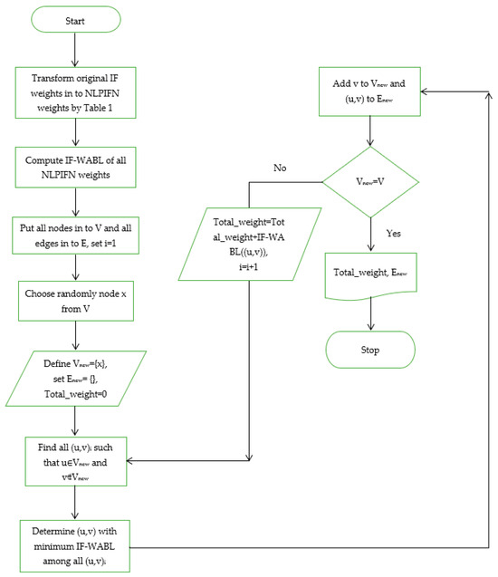In this study, we proposed a version of Prim’s algorithm to evaluate the IF MSTP. Here, we benefited from the flexibility properties of the NLPIFN and IF-WABL method by redefining Prim’s algorithm for the IF MSTP. In our version, one can use any type of IFN (i.e., Linear Pentagonal, Non-linear Trapezoidal, Linear Trapezoidal, Non-linear Triangular, or Linear Triangular) to state the edge weights of the problem. At the very beginning stage of the problem solution process, we transformed each type of IFN into a NLPIFN by utilizing the component selection alternatives given in Table 1. Next, we employed the IF-WABL defuzzification formula given in Theorem 2 to compute the defuzzified values of the NLPIFN edge weights. In every step of Prim’s algorithm, the arc that has the lowest weight among the remaining arcs must be located. Then, we extended the solution tree to realize a solution to the problem. The re-defined version of Prim’s algorithm for the IF MSTP can be given as follows: