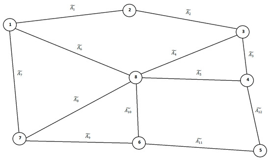 Suppose there are eight oil exploration platforms on the sea. Oil can be extracted from each of these platforms. All the oil obtained must be delivered to land. Laying a pipeline from each platform to the land is a very costly operation; it is a less costly operation to first connect the platforms with pipes and then connect one of the platforms to the land. The most important characteristic when connecting the platforms is the cost. Some platforms cannot be connected to each other due to the lack of suitable physical properties on the seabed. The network given in Figure 3 presents the hypothetical locations of the platforms and possible connections between them. Due to the distance between the platforms, the physical conditions of the seabed, and other natural reasons, the pipe laying costs between the platforms cannot be calculated with certainty. Therefore, these costs expressed in IFNs should be determined by engineers. Without a loss of generality, all of the weights are given as NLPIFNs and their components are given in Table 3. For all NLPIFNs in the example, some values of the components are determined as and ; , , and . Here, we sought to obtain the IFMST of the graph by applying the proposed version of Prim’s algorithm. To apply the proposed approach, we must compute the defuzzified values of the given NLPIFN weights presented in Table 3. The IF-WABL parameters for this example were determined as follows:. The defuzzified values of the NLPIFN weights are computed with respect to the given values of the IF-WABL parameters by utilizing the formula given in Theorem 2.