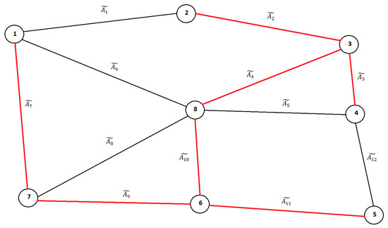 We next used the re-defined version of Prim’s algorithm to solve the given IFMST problem. First, the IF-WABL values of the given NLPIFN weights were calculated. The computed IF-WABL values are presented in Table 3. Node 4 was randomly chosen as the starting point of the algorithm. After Node 4, Nodes 3, 2, 8, 6, 5, 7, and 1 were added to the IFMST. Finally, we reached the solution set of arcs E* = {(4,3), (3,2), (3,8), (8,6), (6,5), (6,7), and (7,1)} for the problem. A graphical illustration of the final solution is given in Figure 4, where red lines are used to emphasize the chosen arcs. The total edge weight was equal to 51.099.