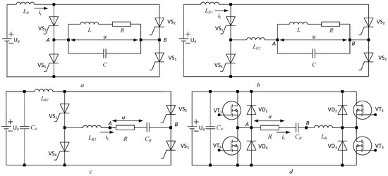 Regardless of the great variety of applications of DC/AC converters, from the point of view of electrical engineering, their equivalent AC circuits are presented most often with a series substitution scheme. For example, in electrical technologies, a substitution circuit consisting of an active load R and a reactive load ωL is used. In this case, the loads for the DC/AC converters are active inductive with a very low power factor cosφT [27,28,29,30]. On the other hand, due to the requirement to obtain a certain active power, it is necessary to compensate the loads with capacitors. Depending on the way the capacitors are connected to the load, parallel and series compensation and a series or parallel load resonant circuits are obtained [27,30]. Figure 1 shows basic schemes of resonant DC/AC converters, using parallel (Figure 1a,b) and series compensation (Figure 1c,d).