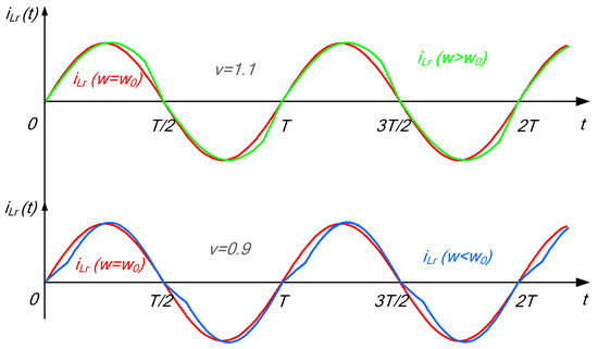 Resonant DC/AC converters with reverse diodes usually operate in continuous–continuous current mode, which is more energy efficient. In this sense, depending on the value of the detuning coefficient ν, two main modes are observed with a control frequency below or above the resonance. Figure 4 shows the shape of the current in the AC circuit in the two operating modes. In addition, the shape of the current when operating in the resonance mode is given as a reference, which gives an idea of the change in the shape of the current at different values of the detuning factor.