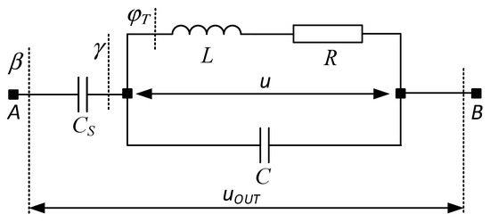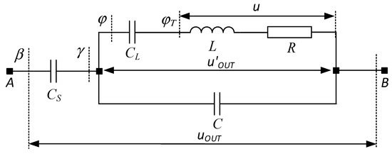 The schematic of a series-parallel resonant output circuit is shown in Figure 6. To obtain a series-parallel resonant inverter circuit, it must be connected to each of the power circuits in Figure 1 between the points labeled A and B. The following notations are used: R and L are the parameters from the load’s series substitution circuit, CS—series capacitor, and C—compensating capacitor connected in parallel with the load.