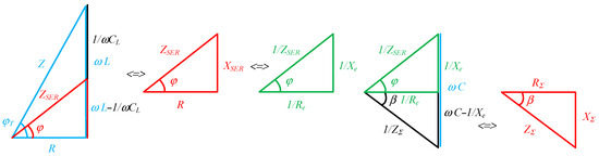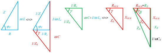 When determining the base ratios for the considered output circuit, the ratio of the load U to the output voltage UOUT expressed by the coefficient is introduced. As parameters for the determination of the analytical dependences, the coefficients already introduced in the analysis of the DC/AC converters will be used: of oscillation k, of detuning ν, and the power factor of the load cosφT. In order to obtain the relationship between the load voltage and the output voltage of the inverter, and also to apply any of the transfer function already determined, the circuit shown in Figure 6 needs to be converted to obtain an equivalent series R-C load. Such transformations are presented in [27], where the concepts of real and ideal detuning of the corresponding resonant circuits are used to express the parameters of the equivalent load. This leads to a significant complication of both the calculation procedures and the physical interpretation of the processes in the power circuit. Another approach is proposed here, which leads to significant simplifications in the determination of analytical dependences and also in the design of resonant DC/AC converters with a complex output circuit. The tool used to achieve this goal is impedance and conductance triangles. Plots that represent the conversion of the output circuit are shown in Figure 7 [28].