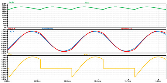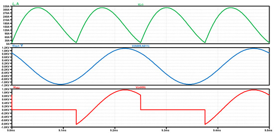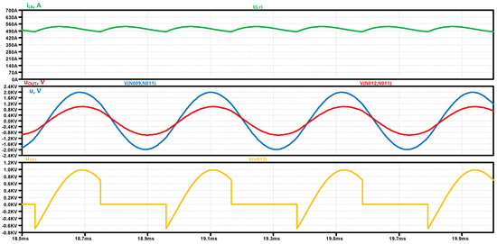 Figure 19 shows simulation results from the study of the parallel-serial current source DC/AC converter. In sequence from top to bottom, the input current iL and the output voltage—UOUT, the voltage on the load—U, and the voltage across the thyristor VS1—uVS1 are presented. The simulation model by which these results were obtained is given in Appendix A.
