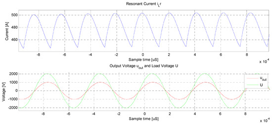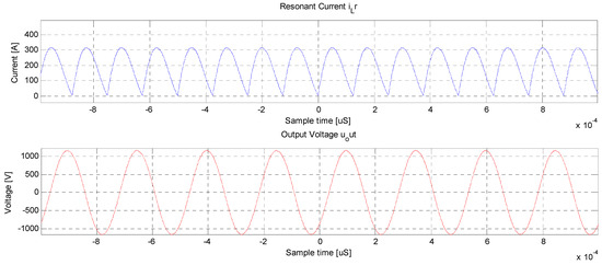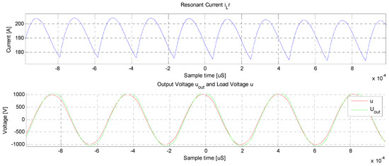 Experimental taken and processed time diagrams of the operation of a parallel-series current source DC/AC converter: (top) resonant inductance current—iLr, and (bottom) output voltage—uOUT and voltage on the load—u.