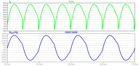 Figure 21 shows simulation results from the study of the designed series resonant DC/AC converter with reverse diodes. From top to bottom, they are presented as follows: the current consumed by the DC power source (it is formed by the sequential operation of transistors and reverse diodes) Id and the output voltage UOUT. From the principle of operation of the considered power topology, it is known that when the reverse diodes are turned on, the AC power from the output is fed back to the DC source. For this reason, there are negative sections in the input current waveform that correspond to the injection of energy from the AC circuit into the DC power source. Appendix A provides the simulation model by which these results were obtained.