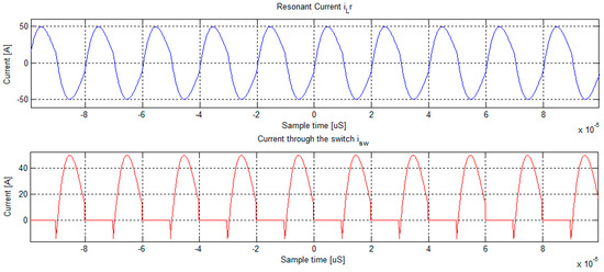 Experimentally taken and processed time diagrams of the operation of a resonant DC/AC converter with reverse diodes: (top) resonant inductance current—iLr, and (bottom) current through the semiconductor switch, composed of a transistor and a reverse diode—iSW.