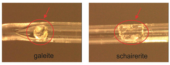 The crystals of galeite and schairerite (circled in red) fixed in quartz capillaries (for more details, see Section 2.2).