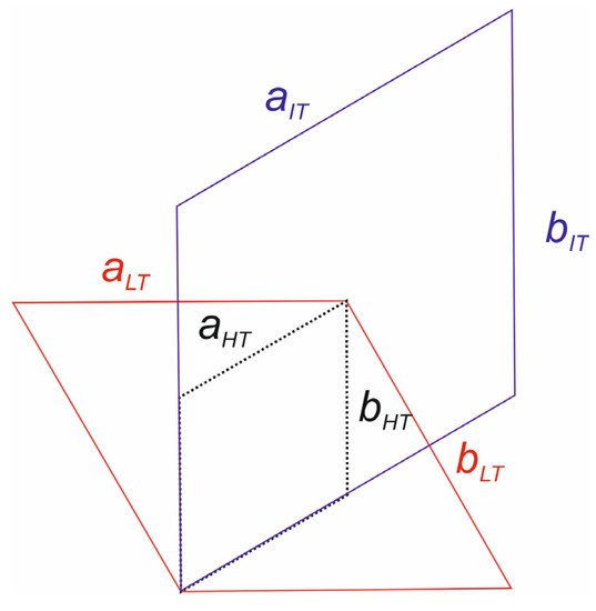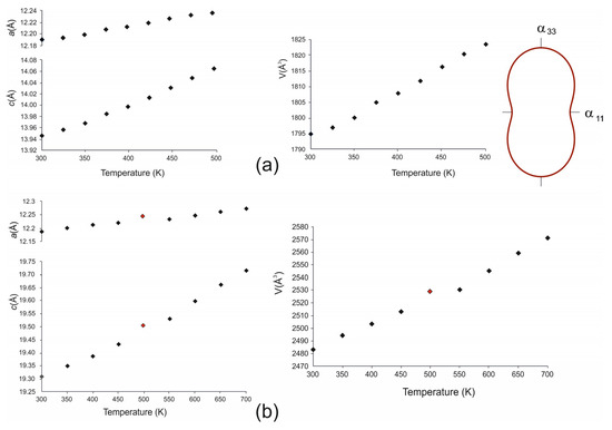 Similar equations for schairerite were derived separately for the LT and HT phases using linear and second-order (for the c parameter) approximations: a = 12.18128 + 0.2 × 10−3 T, R2 = 0.9946; c = 19.2893 + 0.7 × 10−3 T + 0.6 × 10−6 T, R2 = 0.9992; V = 2478.17 + 0.20 × T, R2 = 0.9946 (LT-schairerite); a = 7.031 + 0.1 × 10−3 T, R2 = 0.9986; c = 19.1289 +0.2 × 10−2 T − 0.1 × 10−5 T, R2 = 0.9996; and V = 823.91 + 0.09 × T, R2 = 0.9982 (HT-schairerite). The unit-cell parameters for the HT modification were recalculated in the LT modification setting for the comparison and representation of the data in the same graph. The transition accompanied by the changes in parameters is clearly visible (Figure 7b, 8).
