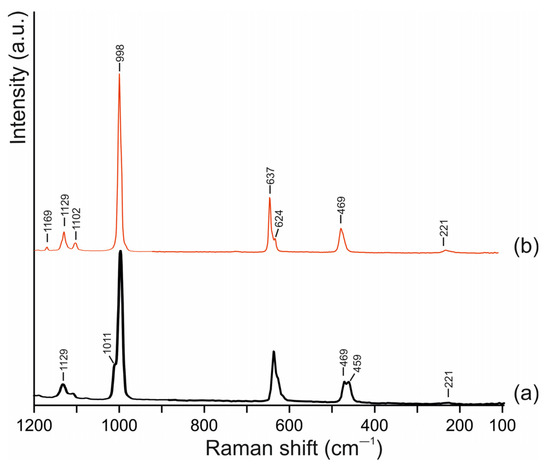 The Raman spectra of galeite and schairerite are shown in Figure 5. They are very similar to each other and are in good agreement with the spectra reported in the RRUFF database for galeite (data on schairerite are not available) [32]. The main bands of both spectra correspond to symmetric and asymmetric vibrations of SO4 tetrahedra: the most intense bands at 998 cm−1 can be attributed to symmetric S-O stretching vibrations (ν1), and the middle-intensity bands at 637 and the shoulder at 624 cm−1 for galeite are in-plane bending vibrations of SO42− groups(ν4), whereas the low-intensity bands at 469 cm−1 for both minerals and at 459 cm−1 for schairerite are attributed to out-of-plane vibrations (ν2); finally, the bands in the 1100–1200 cm−1 region can be attributed to anti-symmetric stretching vibrations. The bands at 221 cm−1 are connected to lattice vibrations [33].