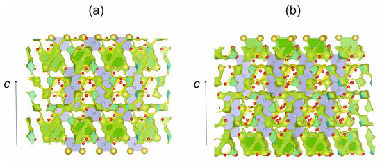 The BVS map isosurfaces (0.10) for sodium ions in galeite (a) and the BVS map isosurfaces (0.15) for sodium ions in schairerite (b). Legend is the same as in Figure 6.