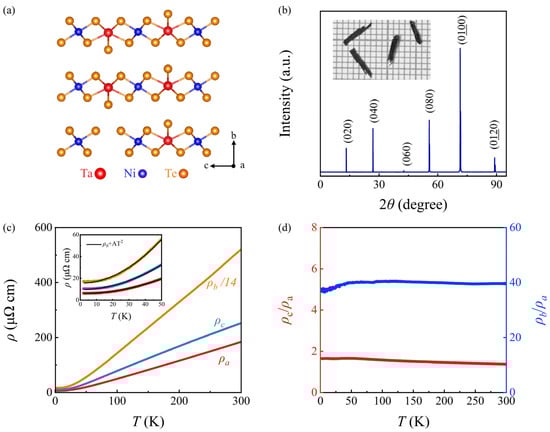 (a) Crystal structure of TaNiTe5 viewed along the a axis. (b) XRD pattern of single crystal. Inset: Typical optical image of TaNiTe5 single crystals. (c) Temperature dependence of the electronic resistivity ρa, ρb, and ρc, with current applied along a axis, b axis, and c axis, respectively, for TaNiTe5. The inset shows the enlarged view of ρa, ρb, and ρc in the low-T regime and the fit to the Fermi liquid paradigm. (d) Temperature dependence of the resistivity anisotropy for ρc/ρa and ρb/ρa, respectively.