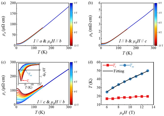 As seen, the resistivity under magnetic field consists of two terms, one is temperature dependence of the resistivity at zero field, i.e., , the other one is magnetic field-induced resistivity, i.e., . Evidently, the two terms have opposite dependence on temperature, so the competition between them lead to a minimum in resistivity under magnetic field [40,55,56]. Figure 4c shows the temperature dependence of resistivity with //b at 0 T [] and 13 T [] and their differences [], respectively. As seen, the differences is fitted with the second term, i.e., with and , as represented by the red solid line. The fitting further suggests that Kohler’s rule is obeyed in TaNiTe5. This indicates that the temperature dependence of the resistivity in a fixed magnetic field is solely determined by , because both α and m are temperature-independent. Furthermore, at low temperatures, becomes low and almost independent of temperature variation. This implies at low temperatures, which is almost constant, giving rise to a resistivity plateau. Thus, the magnetic field-induced resistivity upturn and plateau in TaNiTe5 can be explained with the help of the classical magnetoresistance theory; that is, while TaNiTe5 is nodal-line semimetals, it is not necessary to invoke topological theories to explain the magnetic field-induced phenomenon. This case is similar to WTe2 [40] and TaSe3 [42].