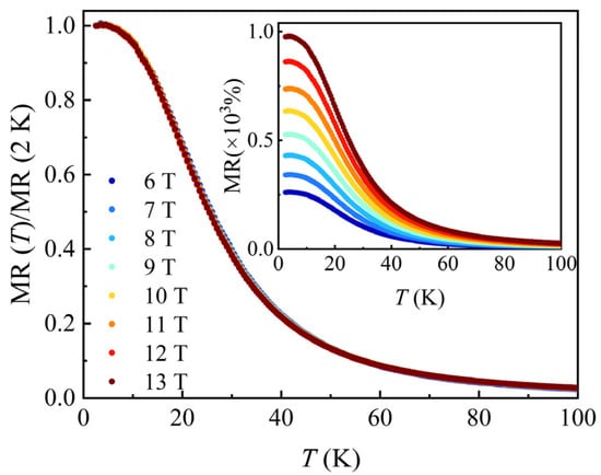 Based on our high-quality single crystals of TaNiTe5, we further measured the temperature-dependent resistivity along each direction of the crystallographic axis under various magnetic fields. As shown in Figure 2a–c, ρa(T), ρb(T), and ρc(T) display interesting anisotropy behavior. Both ρa(T) and ρb(T) show typical metallic behavior with negligible MR until applied field of 13 T. By contrast, ρc(T) shows metallic behavior at high temperatures, while the resistivity reached a minimum at Tm once μ0H ≥ 6 T. Remarkably, below Tm, the resistivity keeps increasing until a resistivity plateau is reached at Ti. A similar anisotropic behavior has been observed in its sister compound TaPdTe5 [22] and NbNiTe5 [15], which reflects the anisotropic electronic properties in this quasi-1D material. To obtain the values of Tm and Ti, we plotted the temperature dependence of the derivative dρc/dT under various magnetic fields, as shown in the inset of Figure 2c. Tm is defined by the point where dρc/dT = 0, and Ti is the point where dρc/dT = 0 is minimum. Figure 2d shows the magnetic field dependence of Tm and Ti. Tm and Ti both increase monotonically with increasing magnetic field, while the increase in Tm is more drastic than that of Ti. And Tm is well fitted using the equation , with fitting parameters ν = 1.73. The value is close to those observed ν = 2 in compensated semimetals WTe2 [40], graphite [48], and bismuth [48]. It was predicted that at T ≤ Tm an excitonic gap can be induced by a magnetic field with [49], which was earlier used as an evidence of a metal–insulator transition. However, as shown in the inset of Figure 3, the MR curves decreases monotonically with increasing temperature without any gap-opening-induced features, such as steps at . Furthermore, as shown in Figure 3, when MR curves at different magnetic fields are normalized with values at 2 K, all curves overlap each other. This is inconsistent with the case of a magnetic field-induced gap, where a steeper slope in MR curves would appear under a higher magnetic field [40,50]; that is, a metal–insulator transition is probably not the origin of the low-T resistivity upturn in our TaNiTe5 crystals.