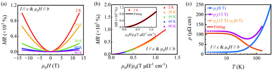For the system with an imperfect compensated (), Kohler’s rule can be still obeyed when the first two terms in the denominator in dominates [40]. We note that in this case, , which is temperature-independent. In the case of temperature-dependent α, Kohler’s rule would be violated [40]. As presented in Figure 4b, the MR curves from T = 2–80 K can basically be scaled into a single curve when plotted as MR vs. ; that is, the temperature dependence of the MR under I//c and //b in TaNiTe5 follows Kohler’s rule, indicating that the scattering mechanism keeps same over the measured temperature and magnet field ranges. Thus, the possibility of an intrinsic field-induced metal–insulator transition can further be ruled out [40,54]. Inset of Figure 4b shows MR as a function of at 2 K from which α and m were determined, and . Kohler’s rule can be rearranged and written as