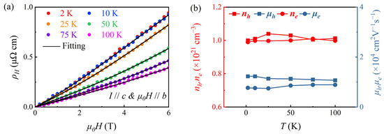 where () and () are density and mobility of holes (electrons), respectively. We fit our measured Hall resistivity vs. as shown in Figure 5a. It can be seen that the fits are well performed with the nonlinear data below 100 K. The obtained values of , , , and are shown in Figure 5b. The result shows that and do not significantly change with temperature. At T = 2 K, and are evaluated to be cm−3 and cm−3, respectively. Simultaneously, the obtained and are 1.23 and 7.70 at T = 2 K, respectively. The relatively low carrier concentrations and high mobility characteristic are consistent with the nature of topological semimetal for TaNiTe5. The ratio , depending on the temperature, points towards a carrier compensation, which fully justifies Kohler’s rule [40,42]. In addition, the results suggest that electron–hole resonance plays the dominant role for XMR in TaNiTe5 when the magnetic field is applied. The case is similar to that in Weyl semimetal WTe2 [40], in which Kohler’s scaling takes into account magnetoresistance of normal metals that do not require topological surface states. Therefore, while the topological surface state is present in single crystals of TaNiTe5, one does not need to invoke this to explain magnetic field-induced resistivity upturn and plateau at low temperatures.