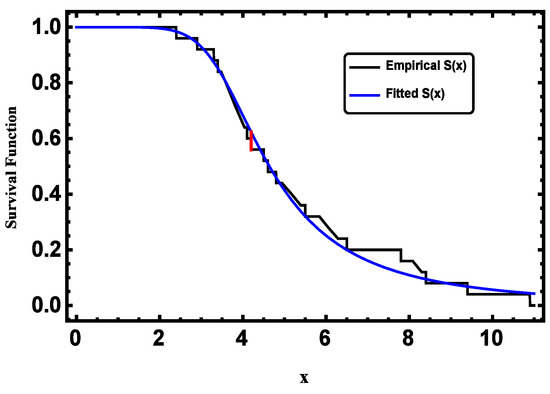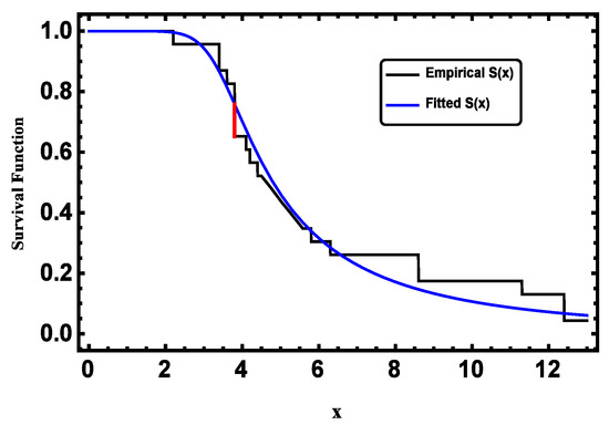 We used the Kolmogorov–Smirnov (K-S) test to check if the data distribution fit the TPBXIID model. For the first sample, the K-S test calculated a value of for TPBXIID, which is smaller than the expected value of at a significance level of with and a P-value of . Similarly, for the second sample, the K-S test calculated a value of for TPBXIID, which is smaller than the expected value of at a significance level of with and a P-value of . Therefore, we can conclude that TPBXIID fits both samples very well. We have also included Figure 2 and Figure 3 to show how well the empirical and fitted values match up. Overall, TPBXIID seems to be an excellent model for fitting these data.