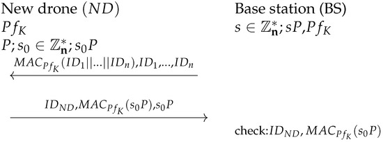 The first step is generating the system parameters, and then the registration is executed between the drone and IoD network participants (the other drones and the base station). We differentiate three participants: a new drone () asks for registration, the base station () manages the registration and communicates with the earlier registered drones (). The set of all binary strings of finite length is represented by . The concatenation of x and y strings is represented by . Before registering, the system generates all necessary parameters and keys. System parameters are given by , where are the parameters of elliptic curve E; ; is a MAC function; and is the size of the MAC value. System parameters are publicly known. To provide message authenticity between the base station and other drones, each drone possesses n symmetric keys (). In addition, for symmetric keys, each participant generates a random value () and then computes the public which are elliptic curve points represented by a bitstring that is necessary for the key agreement. At the end of the registration, the new keys are generated by the elliptic curve Diffie–Hellman key exchange.