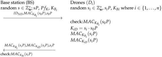 In the case of our protocol, the adversary’s goals are to exchange a key with the base station and the drones successfully. We use the Dolev–Yao model [30] for our analysis. In the Dolev–Yao model, an adversary has the following properties: