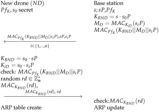 The ARP table is a collection of data necessary for device communication with others. Table 7 demonstrates the structure of the table, which includes device addresses, statuses and types, buffer transfers and symmetric keys for each device. This allows peer-to-peer communication with any drone in the range of the base station, where the drone simply selects the address and associated symmetric key in the ARP table. When the message is created, which contains the value for the new key, the drone uses the AES-GCM symmetric-key cryptographic block cypher and sends the message to the selected party. In the table, each drone’s data take up only 18 bytes of storage, meaning even hundreds of drones would not take up 1 kilobyte of space. In Section 5, we also analyze the proposed ARP table’s solution and find that it requires much less data storage compared to other solutions in related works. The communication needs to include a key exchange process, where we recommend the usage of the elliptic curve Diffie–Hellman key exchange.
