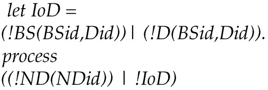 We formalize the protocol as follows. We differentiate four processes. In the main process, Figure 6, the identification numbers for the participants, PUF keys, and symmetric keys are generated. Three sub-processes represent the protocols for the new drone (Figure A1), the base station and the already registered drones. We consider an unbounded number of sub-processes that run simultaneously. Our goal is to create a model representing the interactions between the new drone, the base station and the already registered drones. We also establish formal communication between the base station and the registered drones.