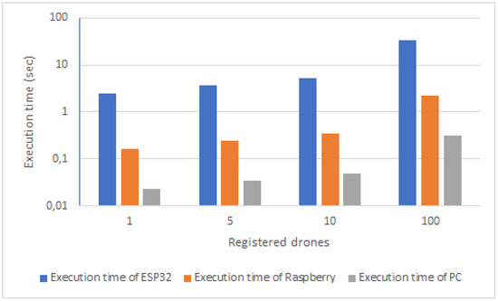 When considering the communication cost, using the P-256 Weierstrass curve and HMAC-SHA-256, the space complexity is s bytes cost, where i is the number of drones. The lengths of the variables are the following: IDs are 16 bytes, an HMAC is 32 bytes, and P-256 consist of 32-Byte x values and 32-Byte y values each. Assuming a swarm of 10 drones, our proposed protocol requires only 2.4 kilobytes of data for new drone registration. We conducted the analysis, which includes the number of operations and the execution time of each. We utilized a PC, a Raspberry PI 4 and an ESP32 for the analysis. The PC we used had an AMD Ryzen 5 5600X processor with 16 GB of RAM. The Raspberry PI is a widely popular, small on-board computer (SBC) that comes equipped with all the necessary software for basic computing. Although the manufacturer recommends Raspbian as the official OS, numerous other operating systems are available as well. In our case, we used a RasPi that features a Broadcom BCM2711, Quad core Cortex-A72 1.5GHz processor and 2 GB RAM. In the tables, i depends on the number of registered drones. Table 2 and Table 3 show the results. Furthermore, as the number of drones was increased, we measured the registration times, which are shown in Figure 8 for the different devices.