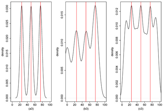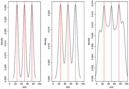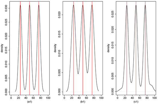 When are generated as (i), the kernel density estimation of the three break points (, , ) obtained by SaRa-M (a1), DCUSUM (b1) and MSSaRa (c1), respectively, is shown. The sample size .