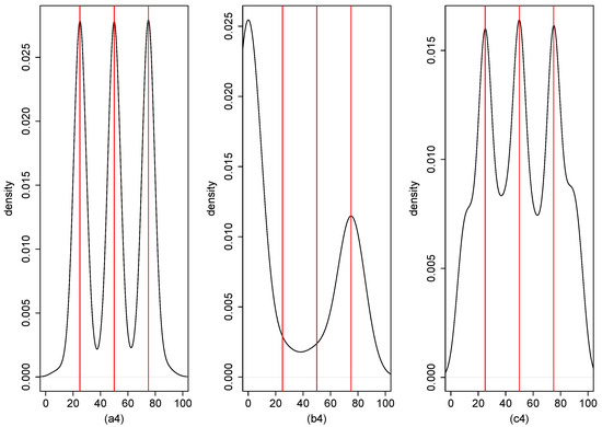 When are generated as (iv), the kernel density estimation of the three break points (, , ) obtained by SaRa-M (a4), DCUSUM (b4) and MSSaRa (c4) respectively, is shown. The sample size .