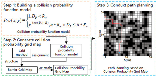 The goal of this article is to construct an environmental map with collision probability information and conduct path planning based on this in order to plan a path with high security. Therefore, we have designed a map construction and path planning method based on collision probability models. Figure 1 provides an overview of the process of planning a secure path using the method presented in this article.