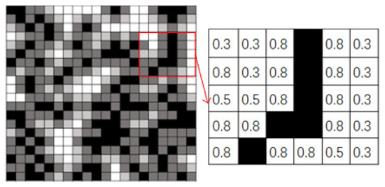 The process of converting an environmental model into a grid map mainly involves dividing the environment into small square areas, called grids. Each grid represents a part of the environment, and each grid is associated with the storage of environmental attributes such as color, height, obstacles, etc. [33]. As shown in Figure 4, the environmental information is simplified into two color grids, where the white grids represent the navigable area of the robot, the black grids represent the non-navigable area (obstacle area), and obstacles that do not occupy the complete grid are inflated. Transforming the key environmental information into raster data can facilitate computer analysis and operation, and improve the robot’s ability to perceive the environment. Therefore, this article uses the grid method to generate a grid map of obstacles of size in MATLAB.
