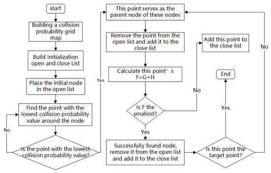 In the classic A* algorithm, the travel mode of the path follows the eight-domain travel mode. The advantage of this mode is that it can display the advantages and disadvantages of the algorithm in a concise and visual manner, but it ignores the safety of the path. Therefore, the algorithm in this article integrates the collision probability value into the actual cost function based on the CPGM, resulting in higher path safety. The process is shown in Figure 6.