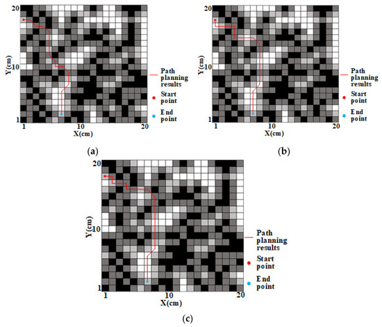 Path planning maps obtained with different weighting coefficients: (a) , ; (b) , ; (c) , . In the map, white is the free grid, black is the obstacle grid, and gray is the danger grid.