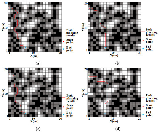 Path planning diagrams obtained by different algorithms: (a) traditional A* algorithm; (b) the algorithm in reference [37]; (c) the algorithm in reference [38]; (d) algorithm in this article. In the map, white is the free grid, black is the obstacle grid, and gray is the danger grid.