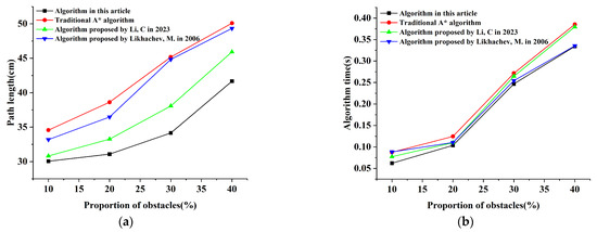 From Table 3, compared with the traditional A* algorithm, the algorithm in reference [37], and the algorithm in reference [38], the path length, algorithm time, proportion of dangerous nodes, and number of turns planned by the algorithm in this paper have all decreased. And from Figure 10, the higher the proportion of obstacles, the more complex the map is, and the search time of all four algorithms has increases. However, compared to the other three algorithms, the search time used in this algorithm is significantly reduced. Through analysis, the algorithm proposed in this article can significantly improve the efficiency of path planning, effectively reduce the number of path nodes, and reduce path costs. Compared to the traditional A* and algorithm in reference [37], the algorithm in reference [38] can more easily find a collision free feasible path.