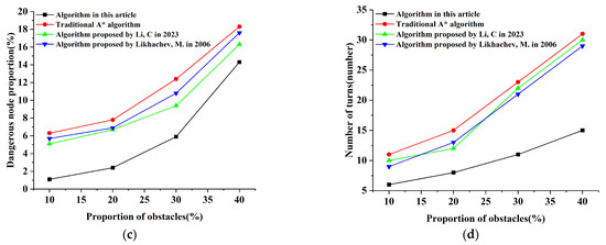 Comparison of path planning parameters for four algorithms under different obstacle ratios: (a) path length comparison; (b) algorithm time comparison; (c) comparison of dangerous node proportions; (d) comparison of number of turns. Among them, algorithm proposed by Li, C in 2023 is from the reference [37]; algorithm proposed by Likhachev, M. in 2023 is from the reference [38].