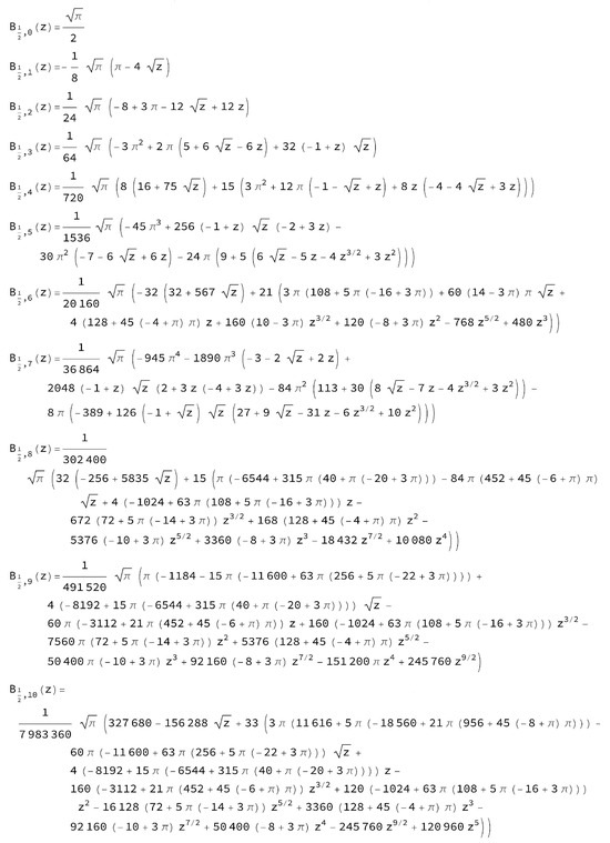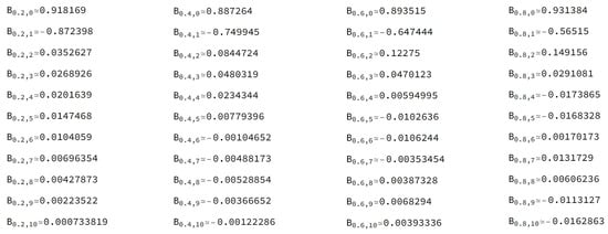 In the particular case when , we find the first ten fractional Bernoulli polynomials as reported in Figure 4.