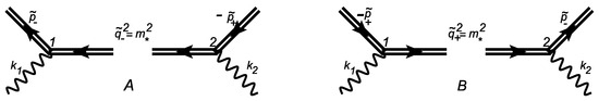 In expression (5), represents the number of photons of the wave emitted at the first vertex, while is the characteristic energy of the EFSCE [27]. In Equation (6), r represents the number of photons absorbed at the second vertex, while (7) is the characteristic energy of the EFSBWP [28,29]. Unlike the first vertex, the number of photons absorbed from the wave r at the second vertex significantly depends on the relationship between the energy of the second gamma quantum and the characteristic energy . Thus, if the quantum parameter is , then the number of absorbed photons of the wave at the second vertex starts from a certain minimum value: (see condition (6) for parameter ). However, if the quantum parameter is , then the number of absorbed photons starts from one: .
