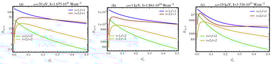 We note that in Equation (11), for frequencies of the X-ray wave eV and keV, the wave parameters were chosen such that the characteristic Breit–Wheeler energy decreases with increasing wave intensity, from GeV to MeV. At the same time, for X-ray frequencies ranging from keV to keV, the wave parameters were chosen such that the characteristic energy of the EFSBWP MeV remains unchanged with increasing wave intensity.