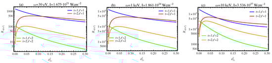 The dependence of the maximum resonant differential cross-section (27), (28), (47) (in units of ) on the square of the positron outgoing angle (Channel A) or the square of the electron outgoing angle (Channel B) for various intensities of the X-ray wave and the characteristic energy of the EFSBWP, as well as the numbers of absorbed (r) and emitted () photons in conditions (10) for the energies of the initial gamma quanta. The energies of the initial gamma quanta: (a)—, ; (b,c)—.
