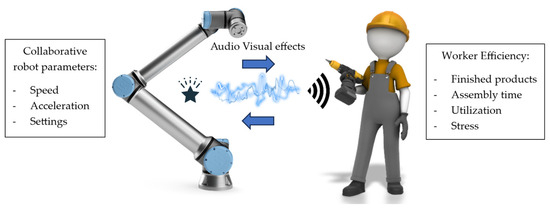 The findings show that the field of Human–Robot Collaboration (HRC) is extremely broad and still relatively unexplored in terms of the mutual relationship between CRs and humans, and vice versa. Throughout the findings of the preliminary experiments and performed studies [9], we have observed changes in human well-being, their behavior, and work performance in various collaborative scenarios. These observations have led us to expand our research and investigate the impact of factors such as the presence of sound, visual contact between the human and the CR, and CR parameters on worker efficiency and well-being, as we believe they play an important role in designing an efficient and healthy HRC. In the present research, we aim to show how the sound level of a CR at different speeds and accelerations affects the worker’s feelings, assembly time, and workplace efficiency, as shown in Figure 1.