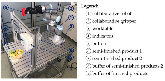 The experiment was conducted in a laboratory environment, for which a CW was adapted. The CW is shown in Figure 2, and it consisted essentially of a CR UR3e ①, a collaborative gripper Robotiq 2F-85 ②, a worktable ③, a switch with signal lights (green and red) ④, a button ⑤, semi-finished products 1 ⑥, semi-finished products 2 ⑦, a buffer of semi-finished products 2 ⑧, and a buffer of finished products ⑨.