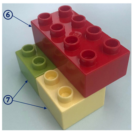 To conduct our experiment, we designed a collaborative assembly application in which a human and a CR worked together to assemble a finished product. The finished product is shown in Figure 3 and consisted of two Lego Duplo 2 × 2 bricks (semi-finished products 2 ⑦) and one Lego Duplo 4 × 2 brick (semi-finished product 1 ⑥).